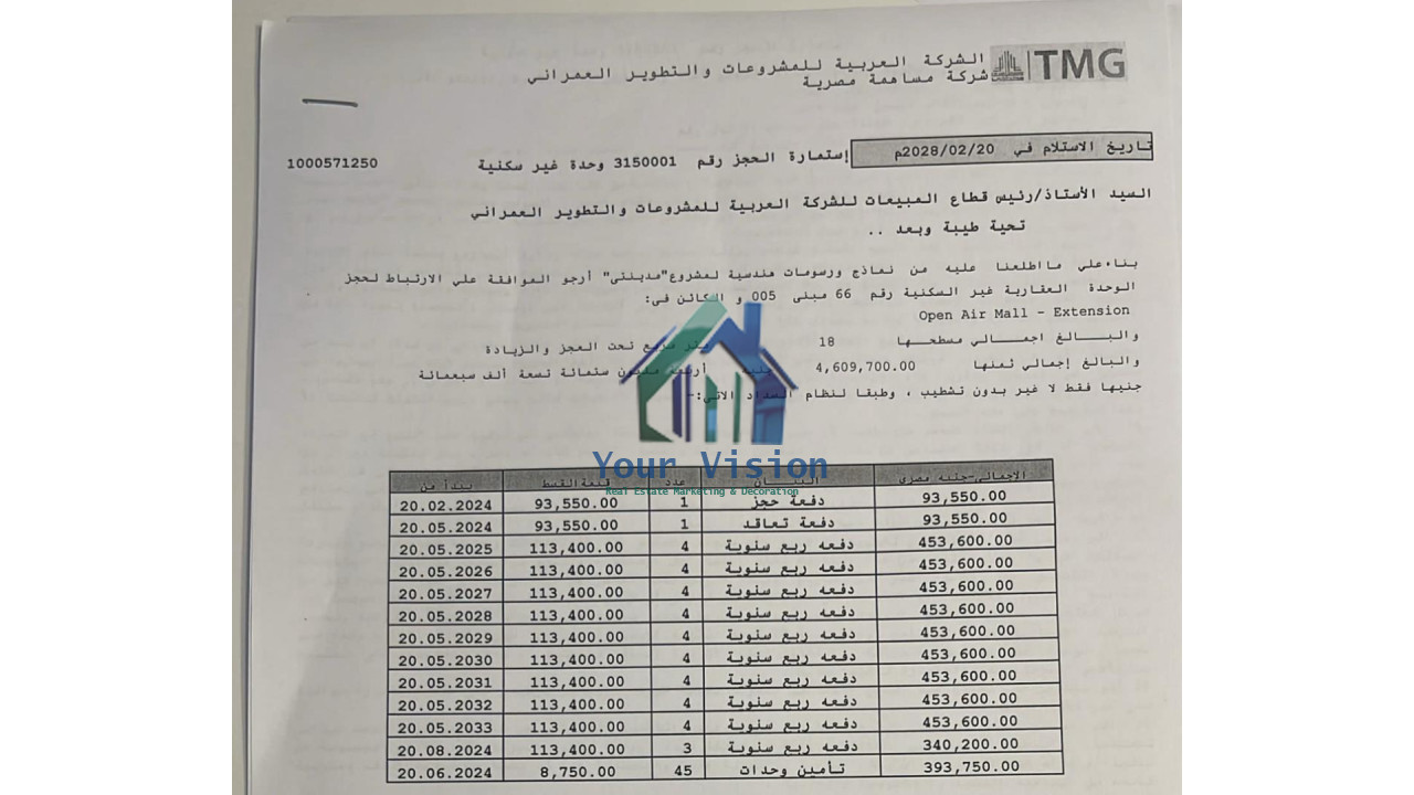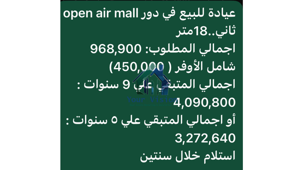 مساحة 18 - تشطيب: لوكس سعر المتر: 53828 مساحة الحديقة: 0 النشاط: انشطه متنوعه مطلوب 968,900