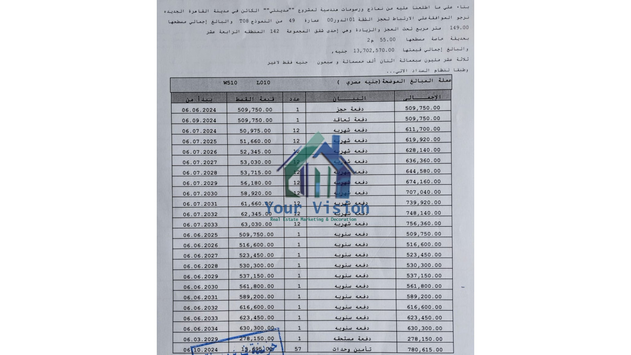 مساحة 149 - مطلوب 3,474,610 تشطيب: شركة المرحلة: B14 النموذج: T08 الفيو: جاردن الدور: ارضي بحديقة نوم: 3 حمام: 2 سعر المتر: 91964 مساحة الحديقة: 149 اجمالي العقد: 13,702,570 المدفوع: 2,624,610 المتبقي: 11,077,960 الاوفر: 850,000 قسط سنوي: 516600 قسط شهري: 51660