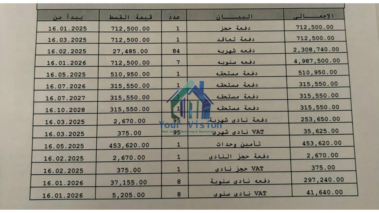 مساحة 83 - مطلوب 2,809,450 تشطيب: لوكس المرحلة: بريفادو النموذج: E الفيو: جاردن الدور: الاول سعر المتر: 130241 مساحة الحديقة: 0 اجمالي العقد: 10,810,040 المدفوع: 2,609,450 المتبقي: 8,200,590 الاوفر: 200,000 قسط سنوي: 712500 قسط شهري: 27485