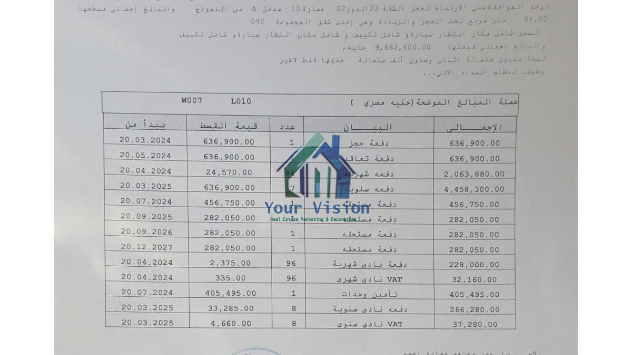 مساحة 84 - مطلوب 3,521,825 تشطيب: شركة المرحلة: بريفادو النموذج: c الفيو: جاردن الدور: الثاني نوم: 2 حمام: 1 سعر المتر: 115030 مساحة الحديقة: 0 اجمالي العقد: 9,662,600 المدفوع: 3,521,825 المتبقي: 6,140,775 الاوفر: 0 الوديعة: 282050 قسط سنوي: 636900 قسط شهري: 24570